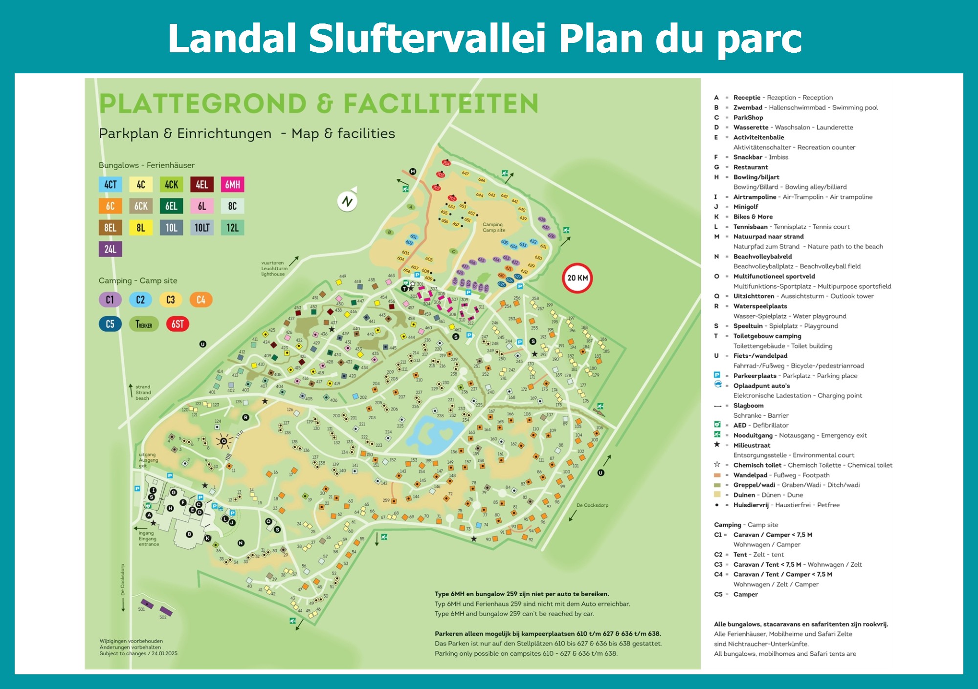 Le plan actuel du Landal Sluftervallei avec tous les hébergements et installations, est aussi disponible en pdf.