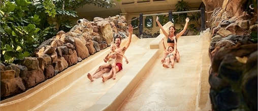 Roetsj van verschillende glijbanen in de Aqua Mundo. Ga jij voor een snelle afdaling of liever een glijbaan waar je met de hele familie vanaf glijd?