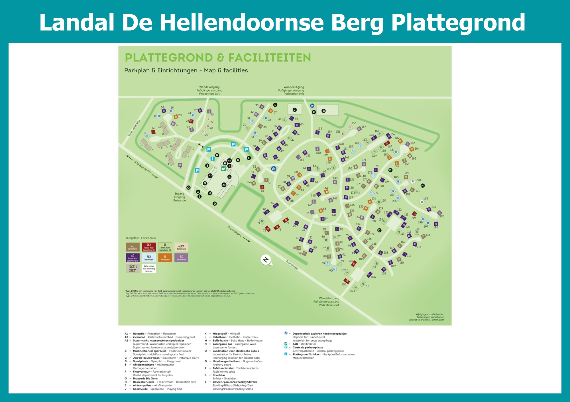 Actuele en overzichtelijke park plattegrond van Landal De Hellendoornse Berg met alle huisjes en faciliteiten, ook te downloaden als PDF.