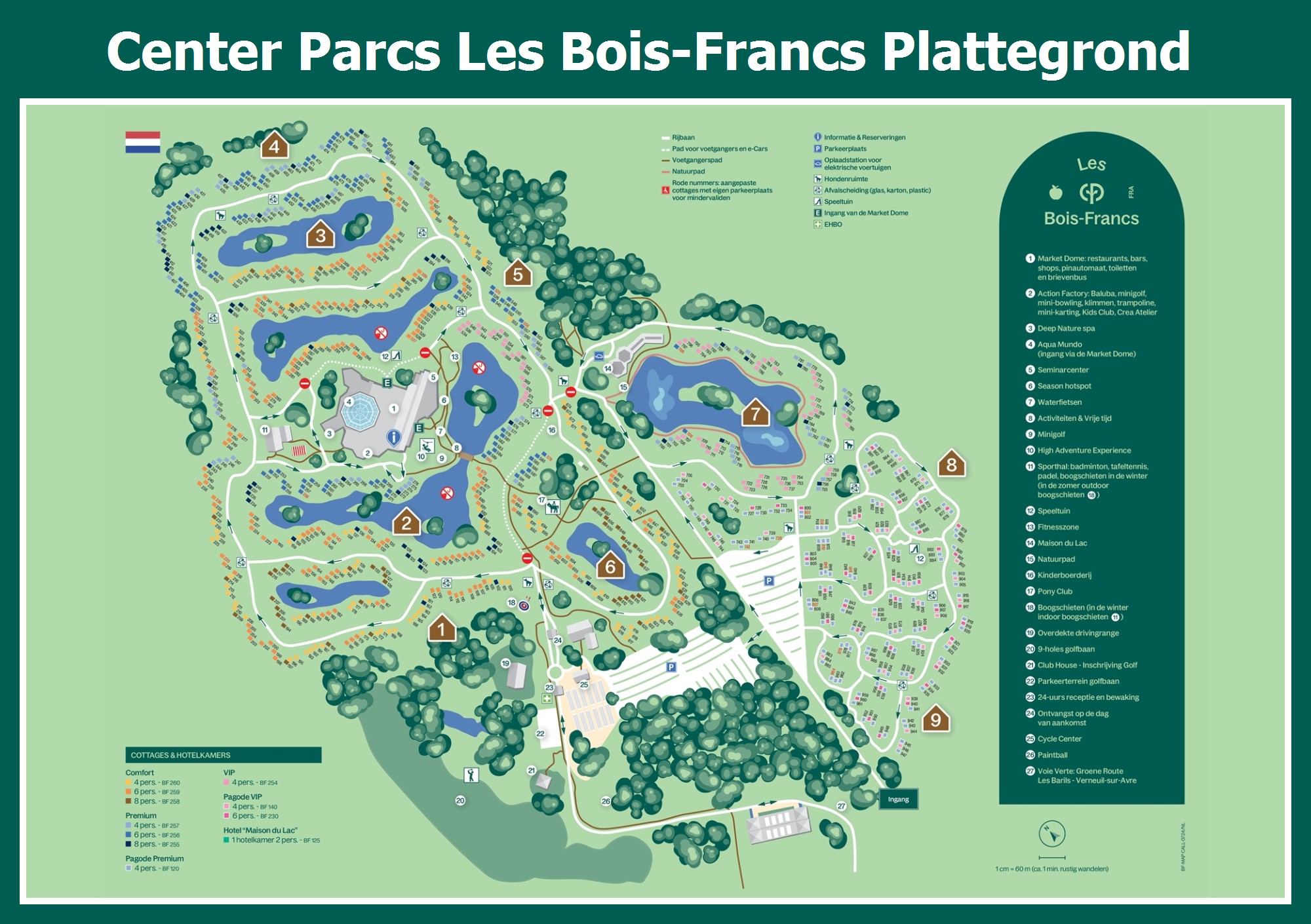 Actuele en overzichtelijke park plattegrond van Center Parcs Les Bois-Francs met alle huisjes en faciliteiten, ook te downloaden als PDF.