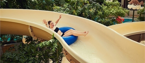 Roetsj van verschillende glijbanen in de Aqua Mundo. Ga jij voor een snelle afdaling of liever een glijbaan waar je met de hele familie vanaf glijd?