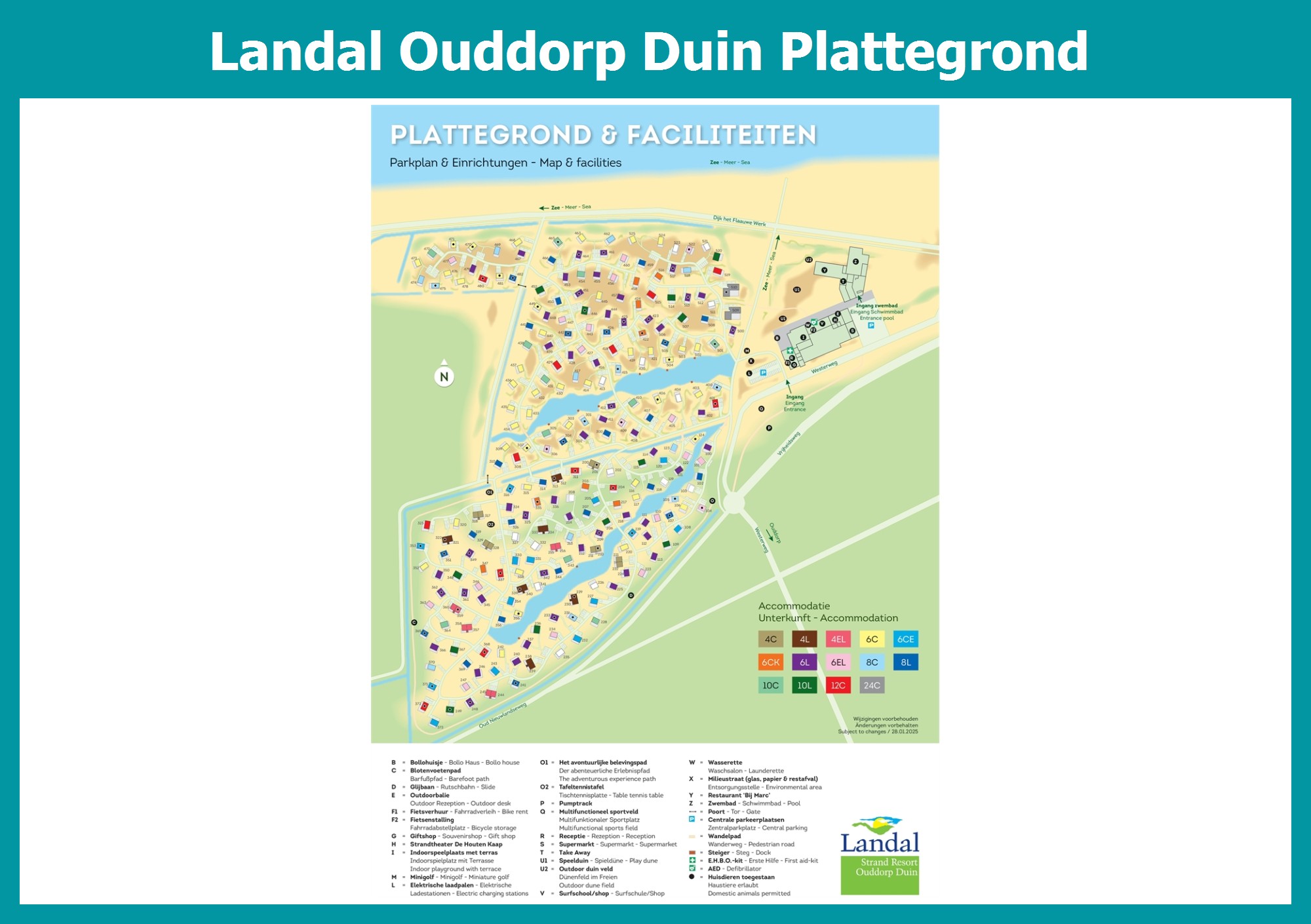 Actuele en overzichtelijke park plattegrond van Landal Ouddorp Duin met alle huisjes en faciliteiten, ook te downloaden als PDF.